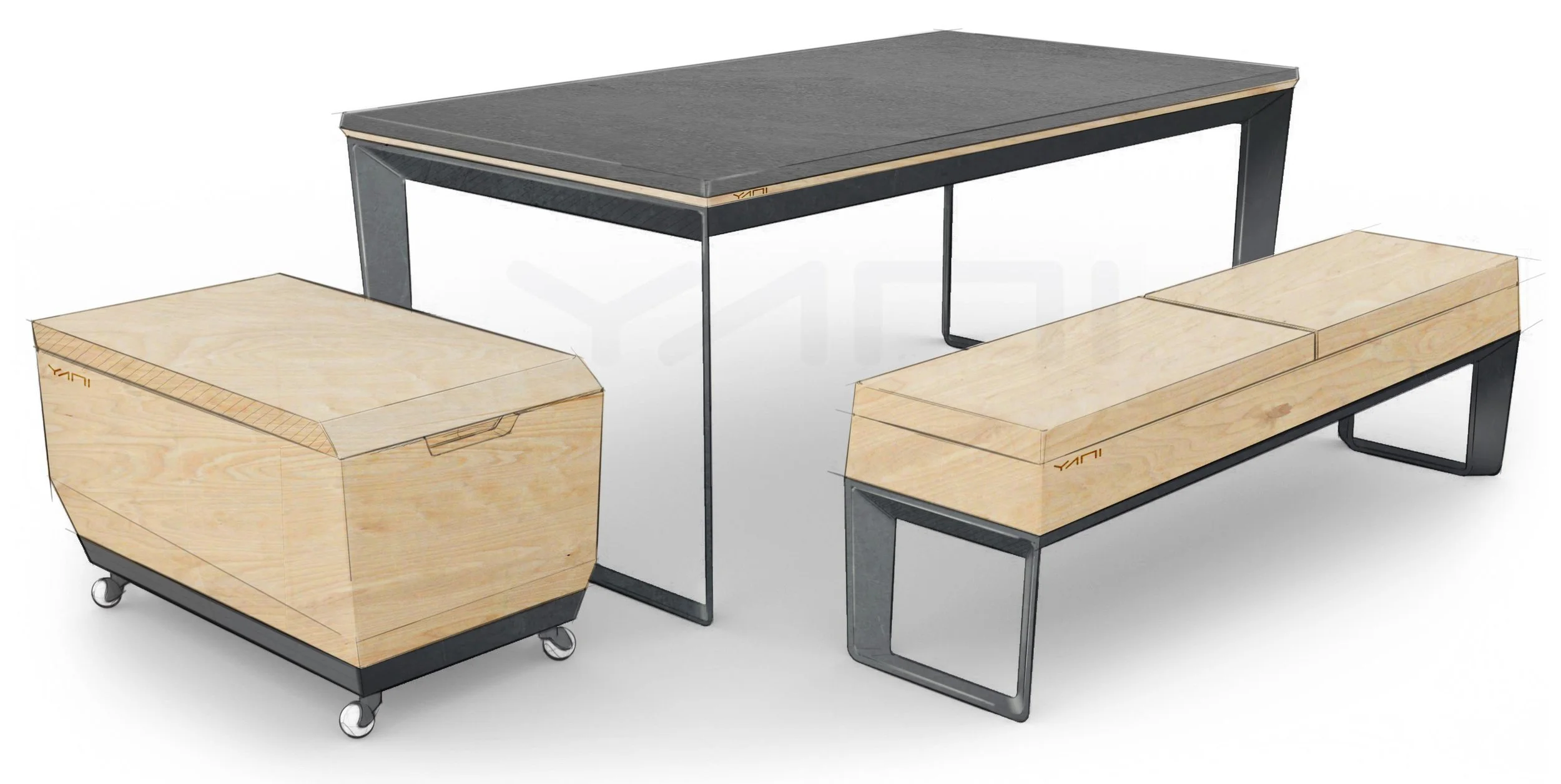 The SAN concept is a furniture set designed for a minmlaist lifestyle and promote sustainability, functionality, and durability. This furniture line includes multi-functional pieces such as a table, bench and chest/coffee table crafted from steel, concrete, and wood, ensuring longevity and recyclability.
