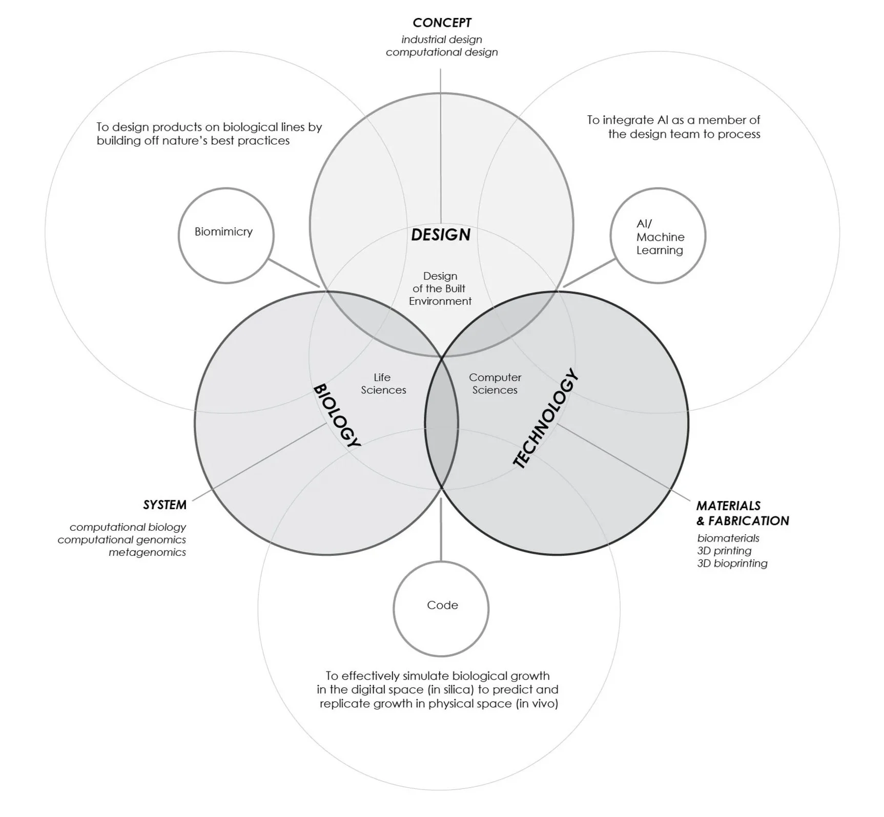 Concept_ In this phase the team creates a near future design solution to a design problem. We ideate a concept by researching the most relevant biological references, understanding the latest in biotechnology, and by finding alternative applications of emergent technologies to our concept. AI can be employed to help cataloging and synthesizing research papers and scientific references.