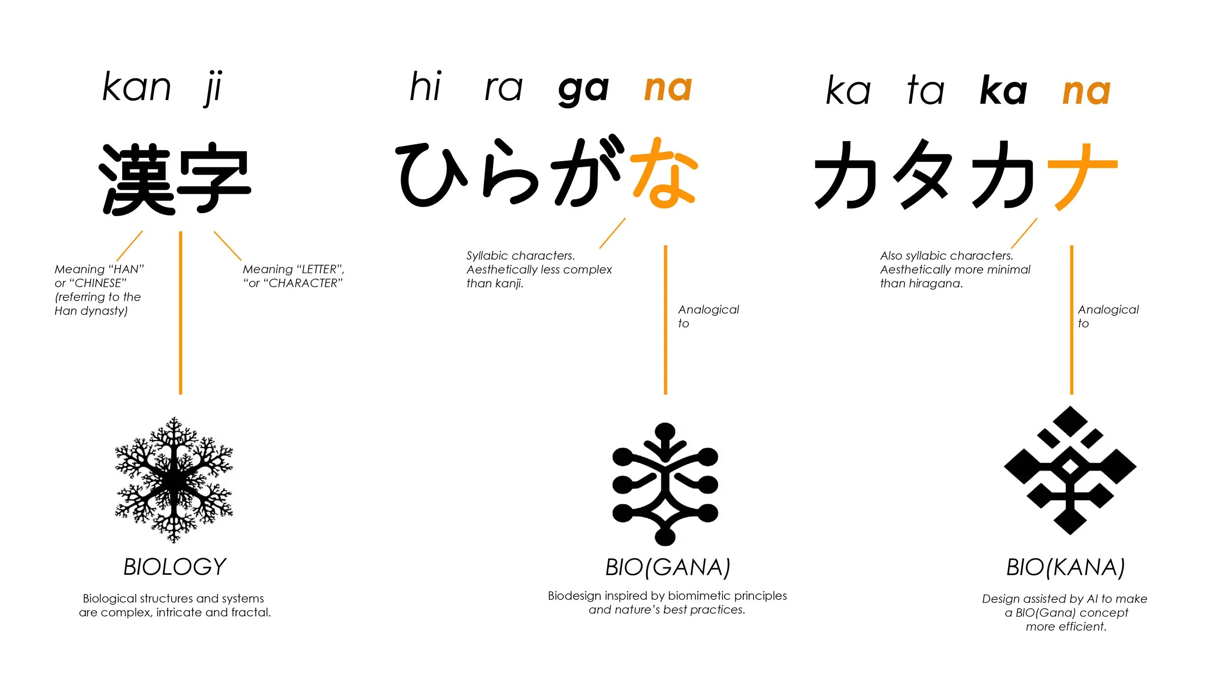 Hence the analogy of being inspired by nature (biological kanji) to create BioGana (biological hiragana), or better yet, a BioKana (biological katakana) design solutions.